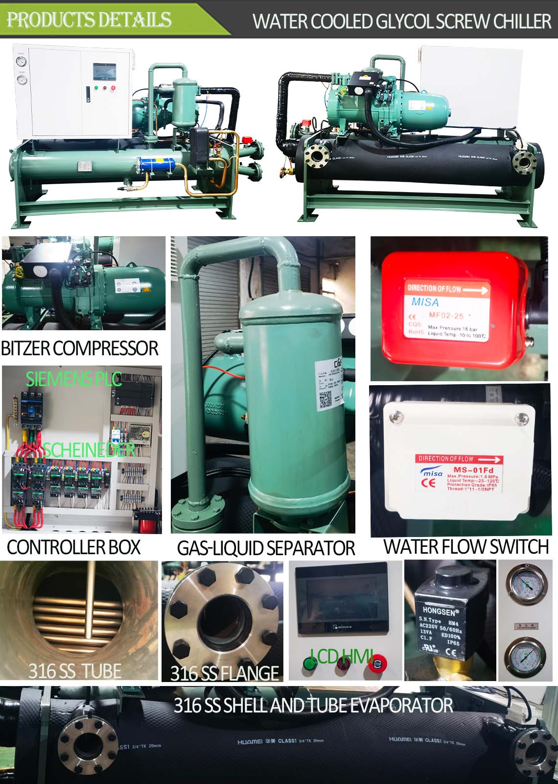 Reliable Performance: Built with durable components, the chiller ensures long-lasting and trouble-free operation, minimizing downtime and maximizing productivity. Evaporator adopt 316 Stainless Steel shell and tube.Corrosion protection and long lifetime.