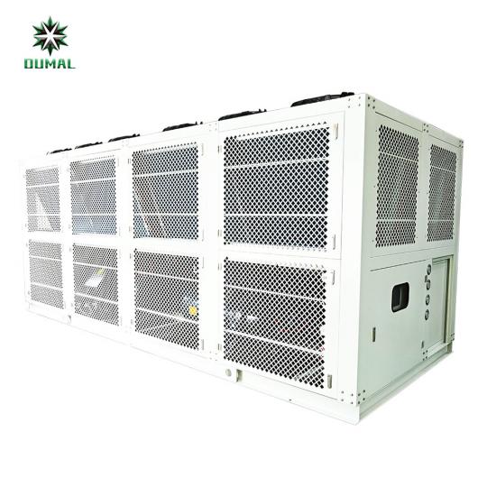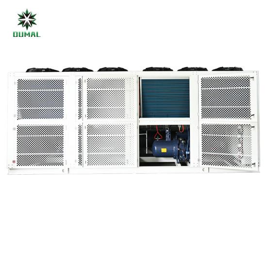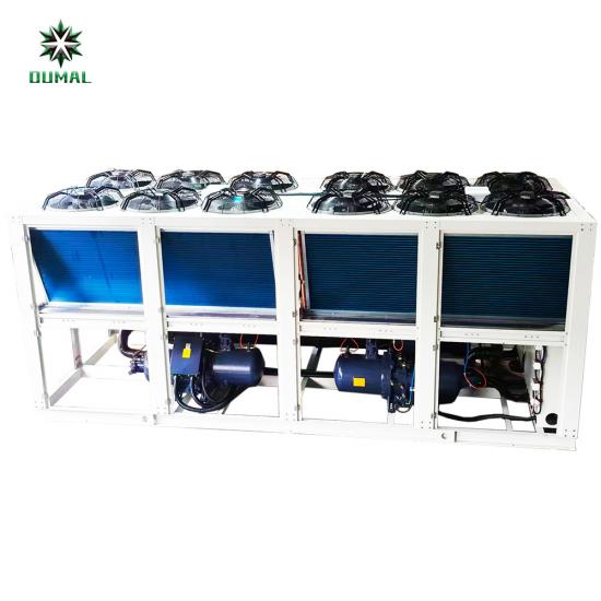 Refrigeration equipment is very important in poultry farms, therefore chillers are widely used in this industry. In poultry farms, chillers are mainly used to lower the temperature inside the chicken coops, preventing the adverse effects of high temperatures on the chickens, such as heat stress and increased mortality rates. Temperature control also plays a crucial role in the incubation process of chicks. OUMAL CHILLER provides professional refrigeration solutions to precisely control incubation temperatures, ensuring a smooth and successful chick hatching process. This is a 100rt air cooled screw chiller using in the poultry farm. The chiller equipped with 2 Hanbell screw compressors. 12 sets Cooling Fan for the condenser, high efficient shell and tube evaporator. Controller system adopt Siemens PLC.